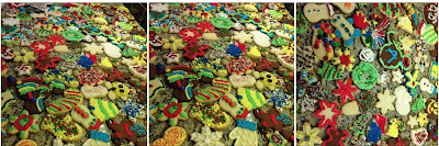 – Children decorating sugar cookies, icing and sprinkles covering the kitchen.