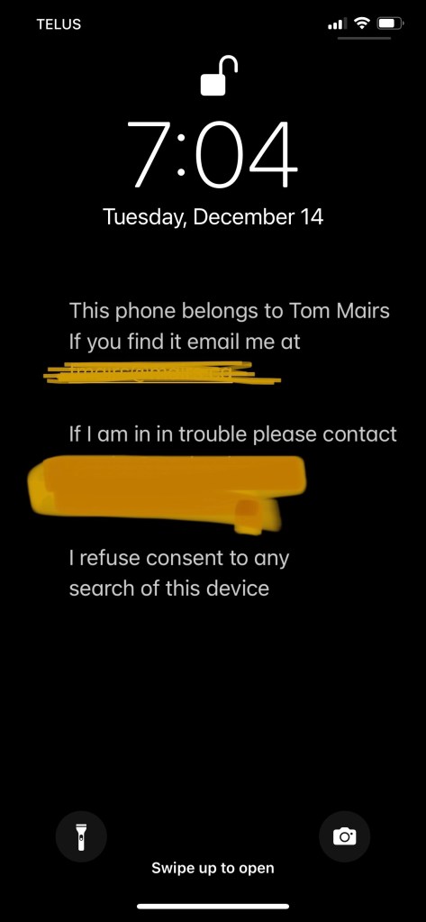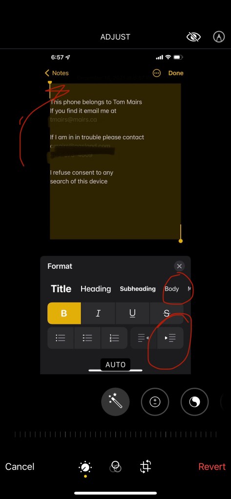 I started with a new note with my phone in “dark mode” so it has a black background. That was just my preference, you could easily use any background for this. The text of the note should include information about you and who to contact if necessary. Start with something like “My name is …” or “this phone belongs to …” and add emergency information like “If I am hurt, contact …”.