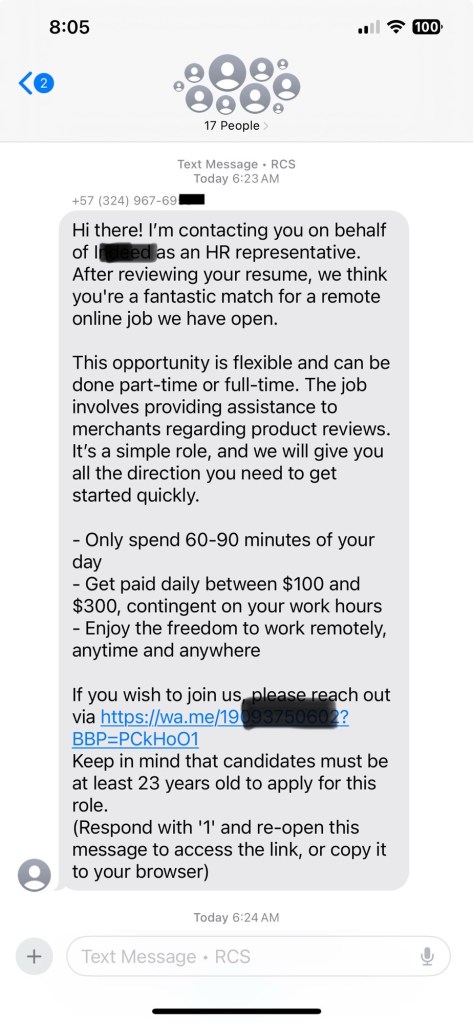 I received this message today on my phone. The company name has been blacked out of the message because I am sure it was not actually from them. This was sent in a group chat to 16 numbers, clearly meeting the definition of SPAM. The message originated from a number in Colombia (+57 country code) but was sent to 16 Canadian phone numbers. FWIW, I received this 3 times from 3 different Colombian numbers to different sets of Canadian numbers. In total, I counted 46 CASL violations in 15 minutes.